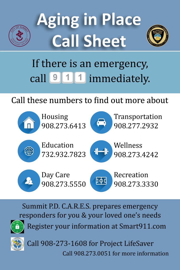 During June 2019, Summit, NJ’s Mayor Radest launched a project titled Aging In Place in order to compile a guide of resources available to senior citizens in the area. Patience worked on this project through a month long internship with the City of Summit. The project yielded 4 items; a data spreadsheet for government employees to quickly understand what resources are available, a 4″x6″ call sheet made optimal for the most common storage locations (on the fridge, in a pantry, in the medicine cabinet, etc.), a full resource guide suited for businesses, and an 11″x8.5″ condensed resource guide. This is a live campaign that was continued after Patience completed the internship.